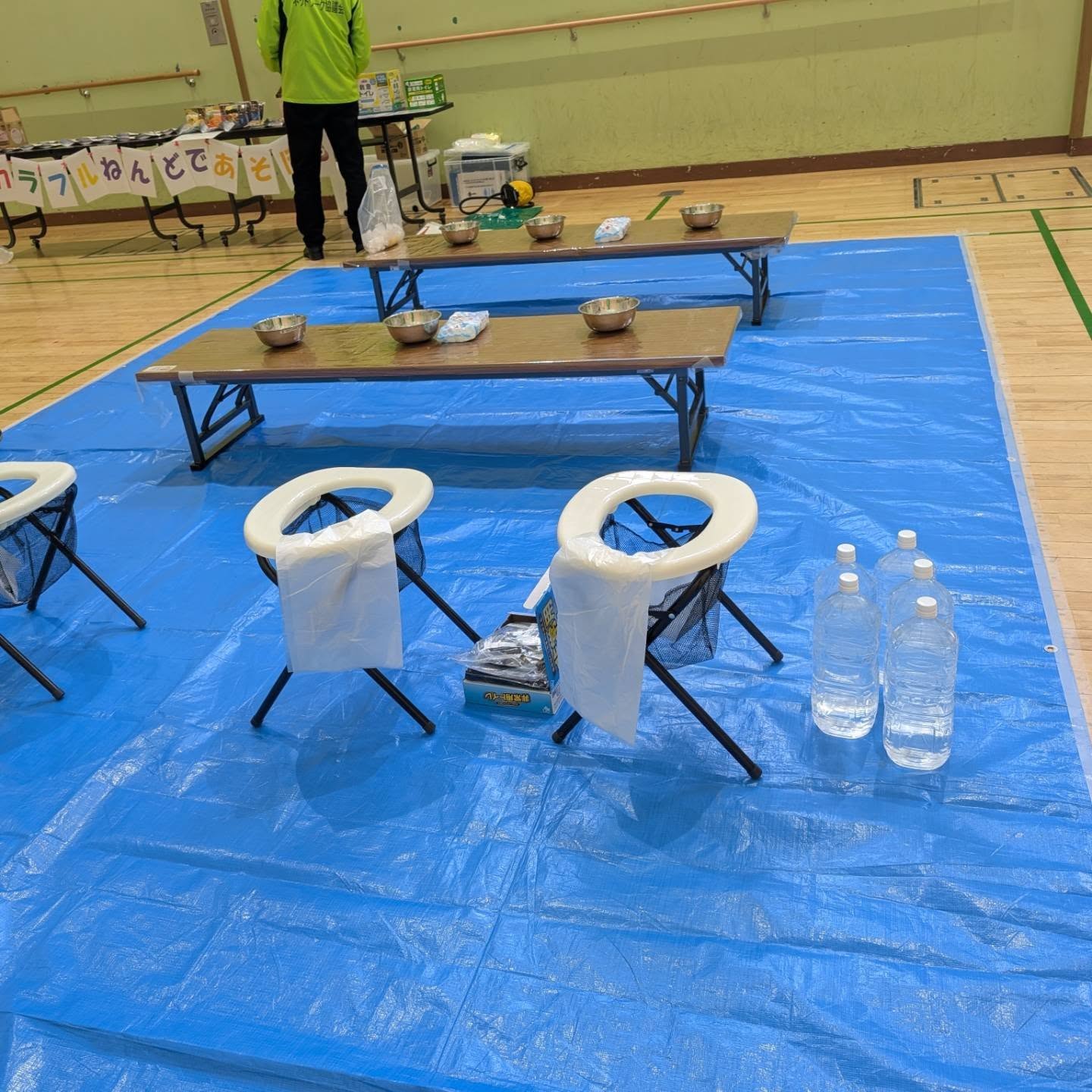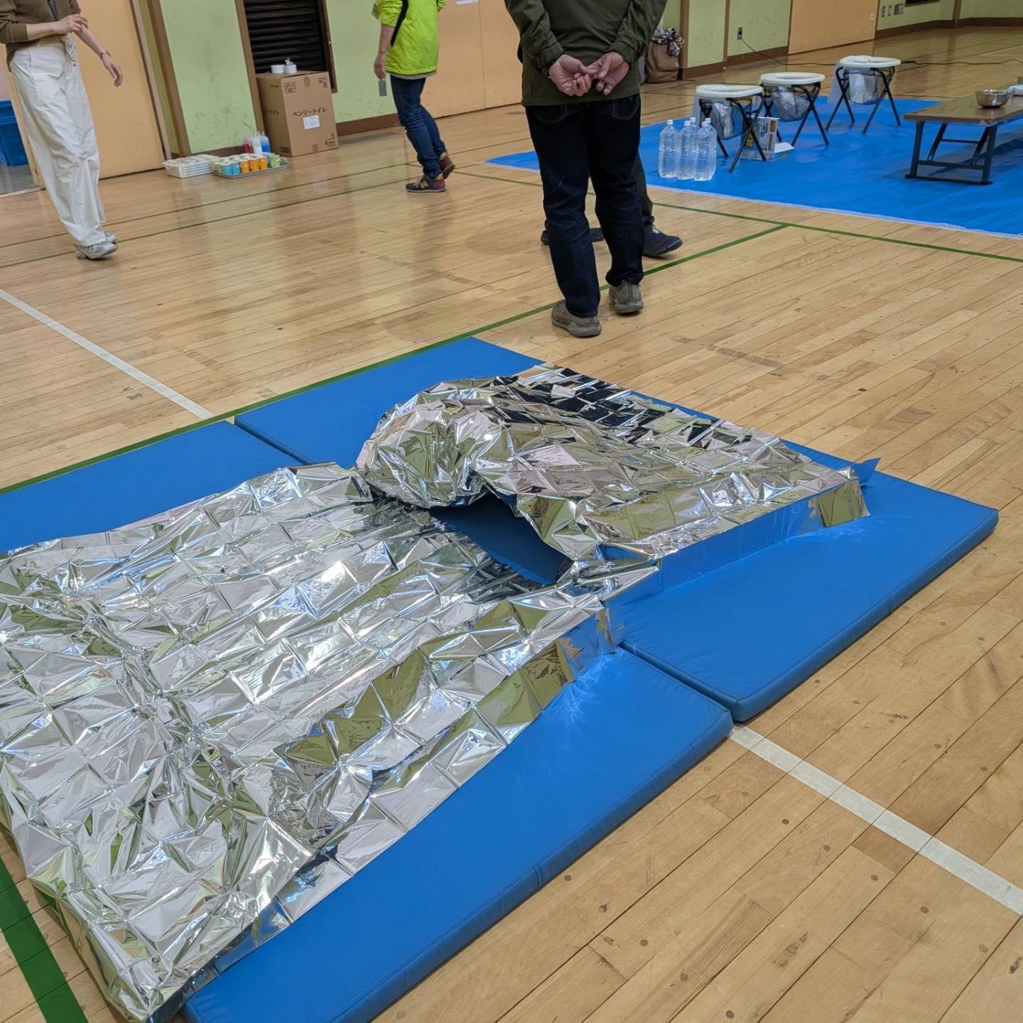 子どもたちや保護者の皆さんに、防災を「体験しながら学んでもらう」イベントとして、災害用トイレ体験やアルミシート体験、避難経路の確認などを行いました。